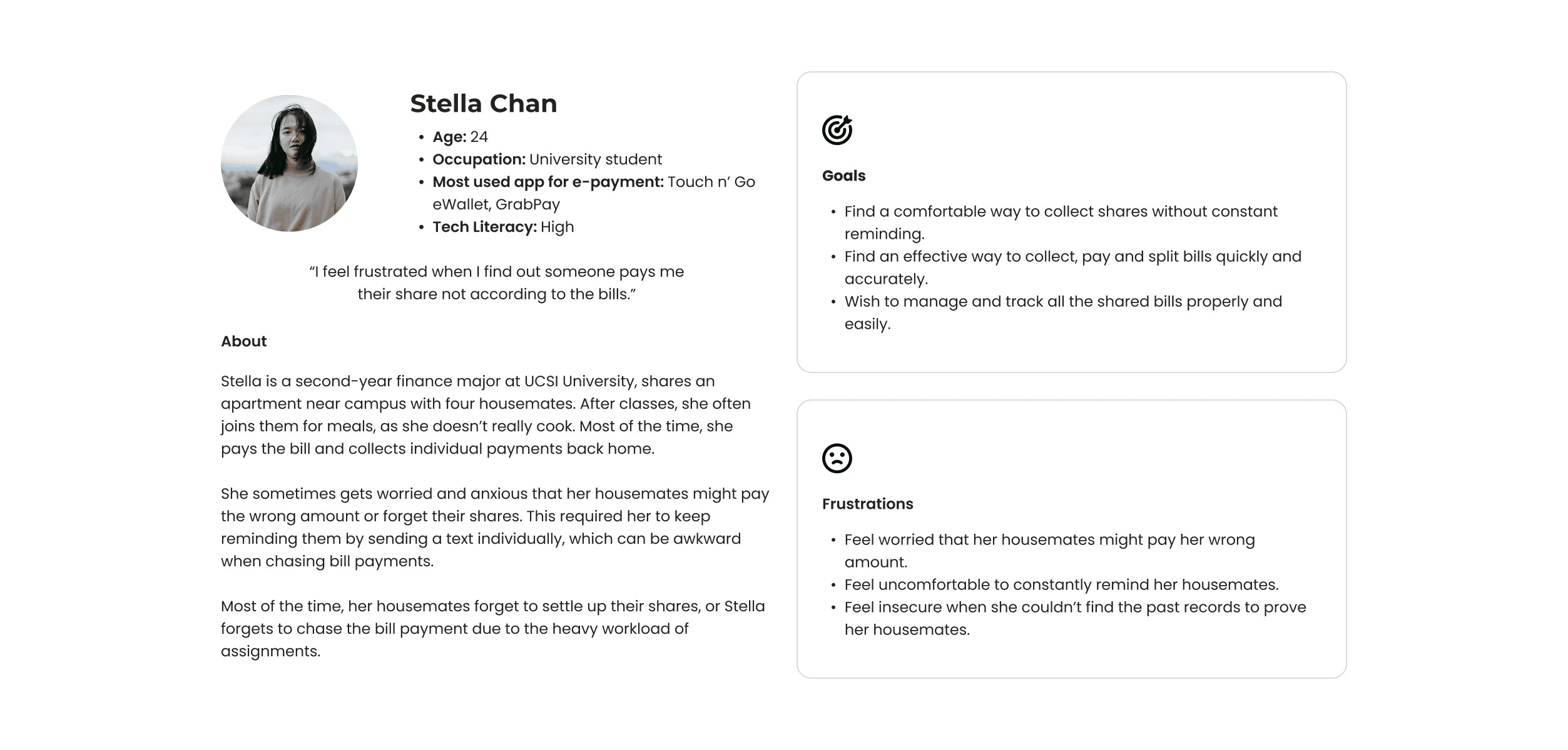 I conducted interviews with 6 individuals, ranging in age from 21 to 55, who regularly use the Touch 'n Go eWallet and have experienced bill-splitting with others. I asked them the following questions to gather insights into the challenges they face and identify potential users’ pain points.