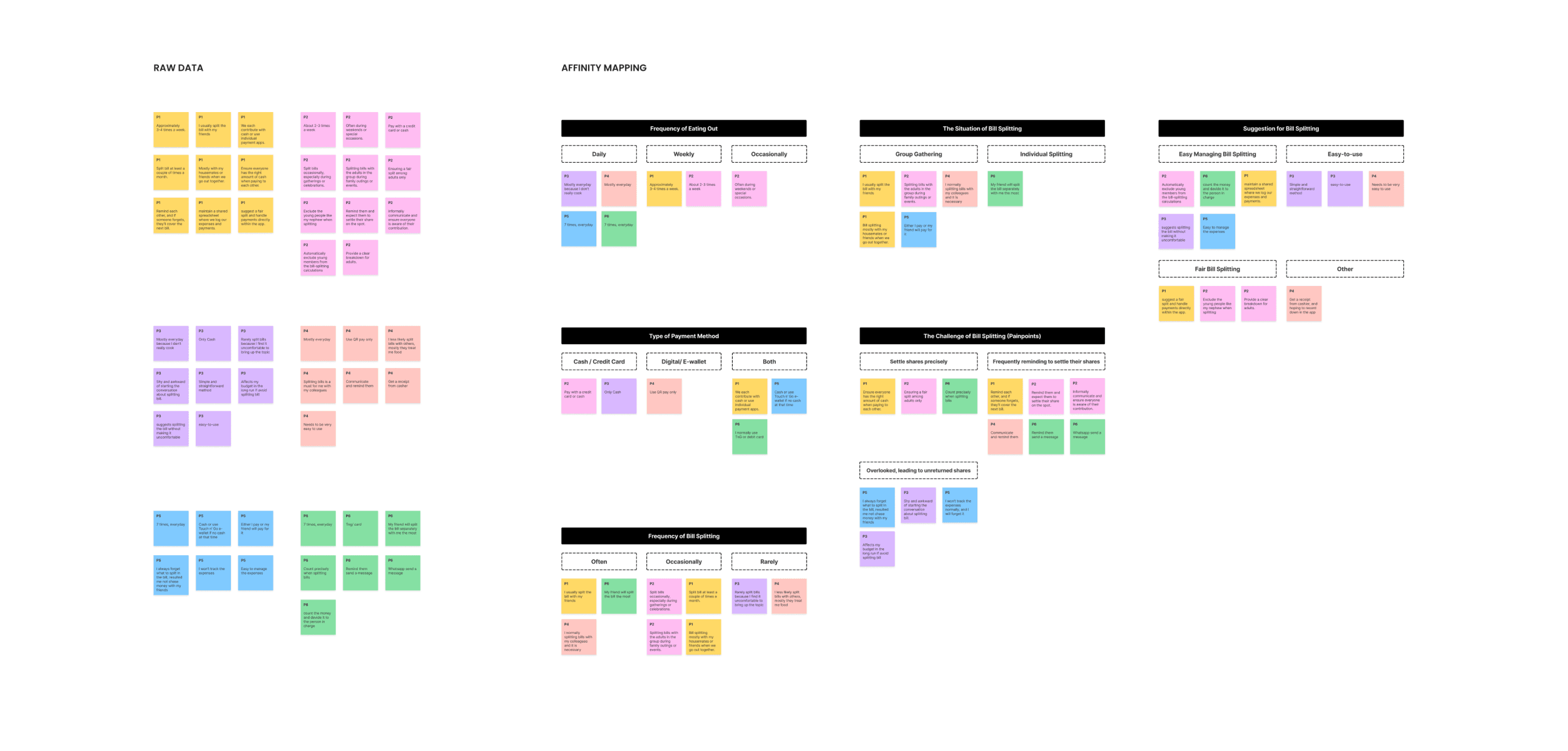 Diving into user feedback, I identified several pain points related to bill-splitting with others. Through synthesising qualitative and quantitative data from affinity mapping, I pinpointed the main insights, key challenges, and concerns that users experience when sharing expenses.