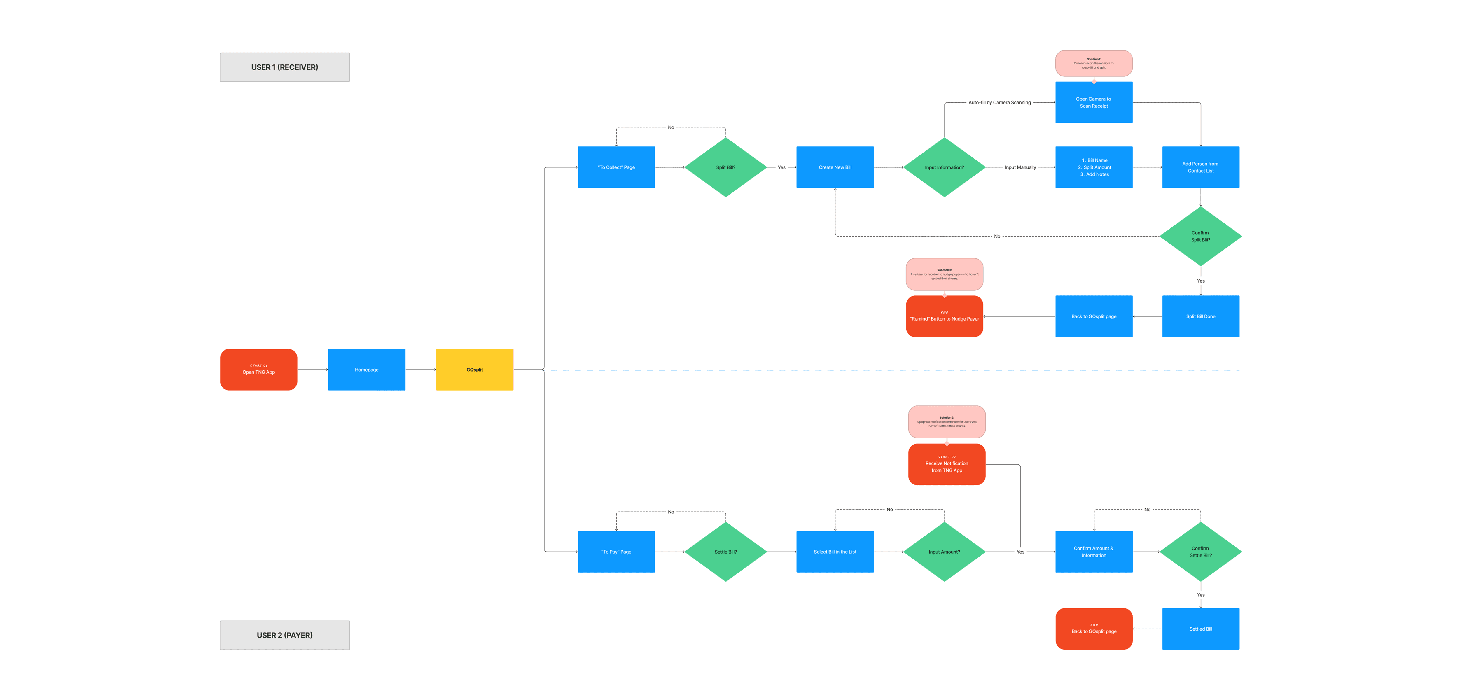 While designing the user flow, I incorporated all 3 solution directions into the journeys of both the Receiver and Payer. This approach helped me identify dependencies, remove redundant steps, and create a smoother experience for both sides of the bill-splitting process.